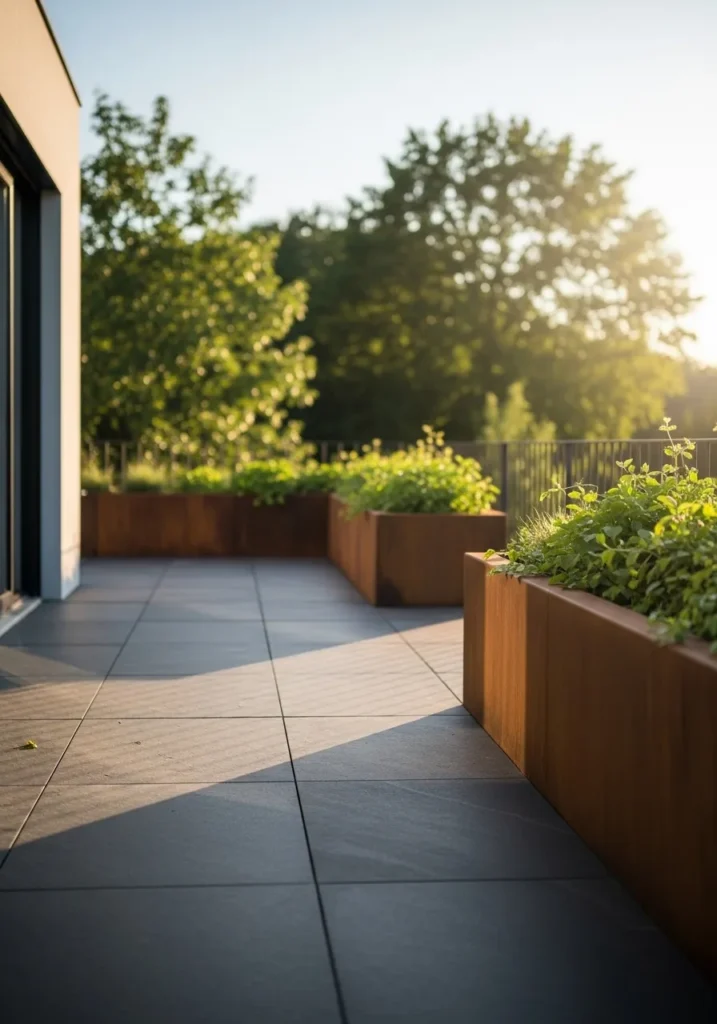 Here we see oversized charcoal porcelain slabs paired with long corten steel planter boxes filled with lush greenery. The deep gray flooring creates a dramatic base, while the rich rust tone of the metal planters adds depth and warmth. Clean edges and simple geometry keep the terrace looking structured and intentional.
