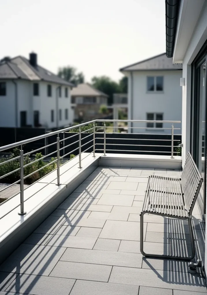 This terrace features rectangular gray stone pavers arranged in a staggered pattern, complemented by a sleek stainless steel railing system. The cool tones of the flooring pair beautifully with the clean metal lines, giving the space a streamlined and contemporary look. The subtle texture in the stone keeps it from feeling flat.