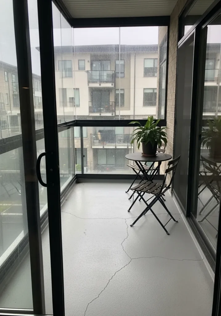 This compact balcony terrace features a seamless microcement floor in a soft gray tone. The continuous finish eliminates visible grout lines, creating a smooth and modern base. A small café style table and plant soften the space, while glass panels allow light to flood in.