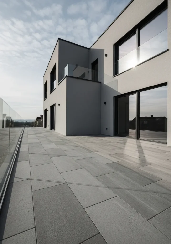 This expansive terrace runs alongside a modern home finished in white and charcoal tones. The floor is covered in large format slate look tiles with subtle color variation that adds depth. The crisp edges of the slabs enhance the strong architectural lines of the house.
