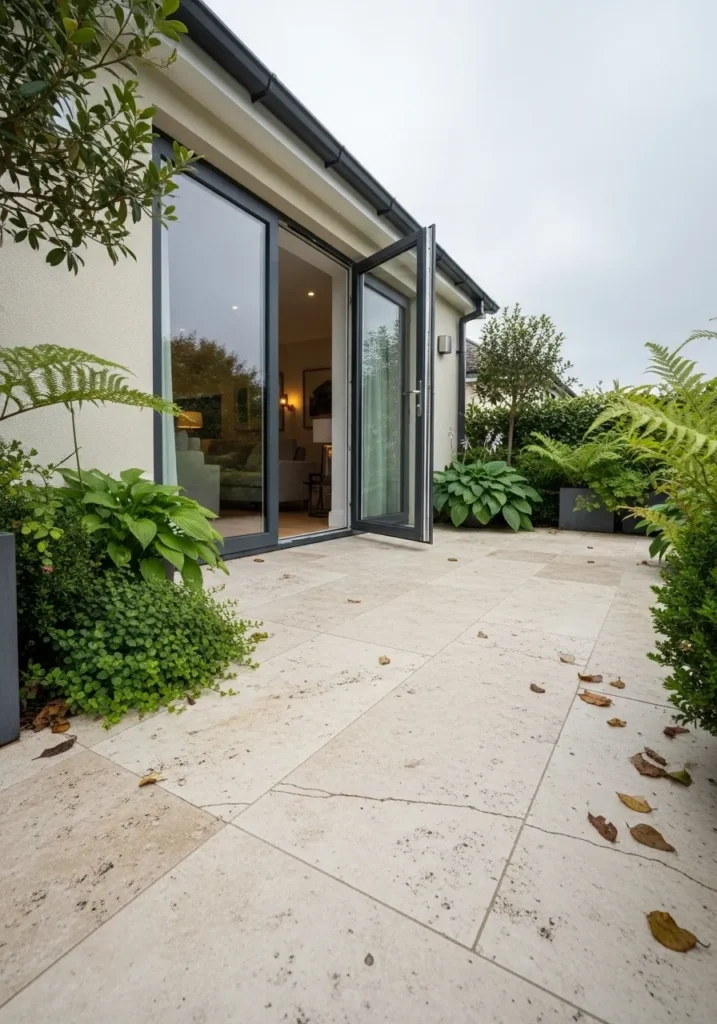 This terrace showcases large light beige travertine style slabs laid in a clean grid pattern. Soft greenery lines the edges, creating a natural contrast against the pale stone. The glass doors reflect the garden and sky, while scattered leaves on the surface give it that lived in, real world feel. The smooth stone finish keeps everything refined but relaxed.
