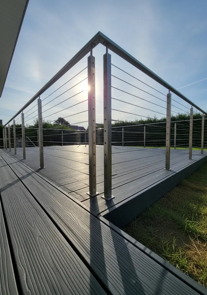 Here we see cool toned composite decking paired with a stainless steel cable railing system. The boards run horizontally, emphasizing the length of the terrace and guiding the eye toward the open yard. The metal posts catch the sunlight, adding a subtle industrial touch that still feels clean and contemporary.