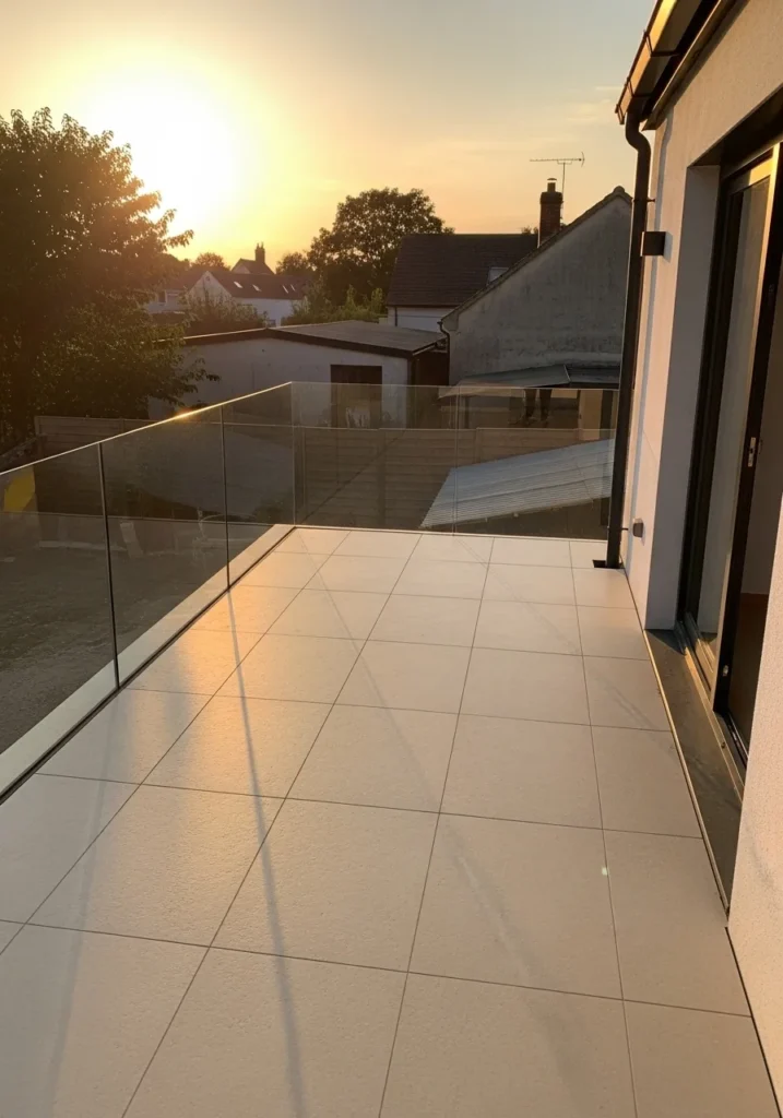 This terrace highlights smooth, glossy beige porcelain tiles that reflect the warm glow of the setting sun. A frameless glass railing borders the edge, allowing the light to bounce freely across the surface. The clean rectangular layout makes the terrace feel larger and more open.