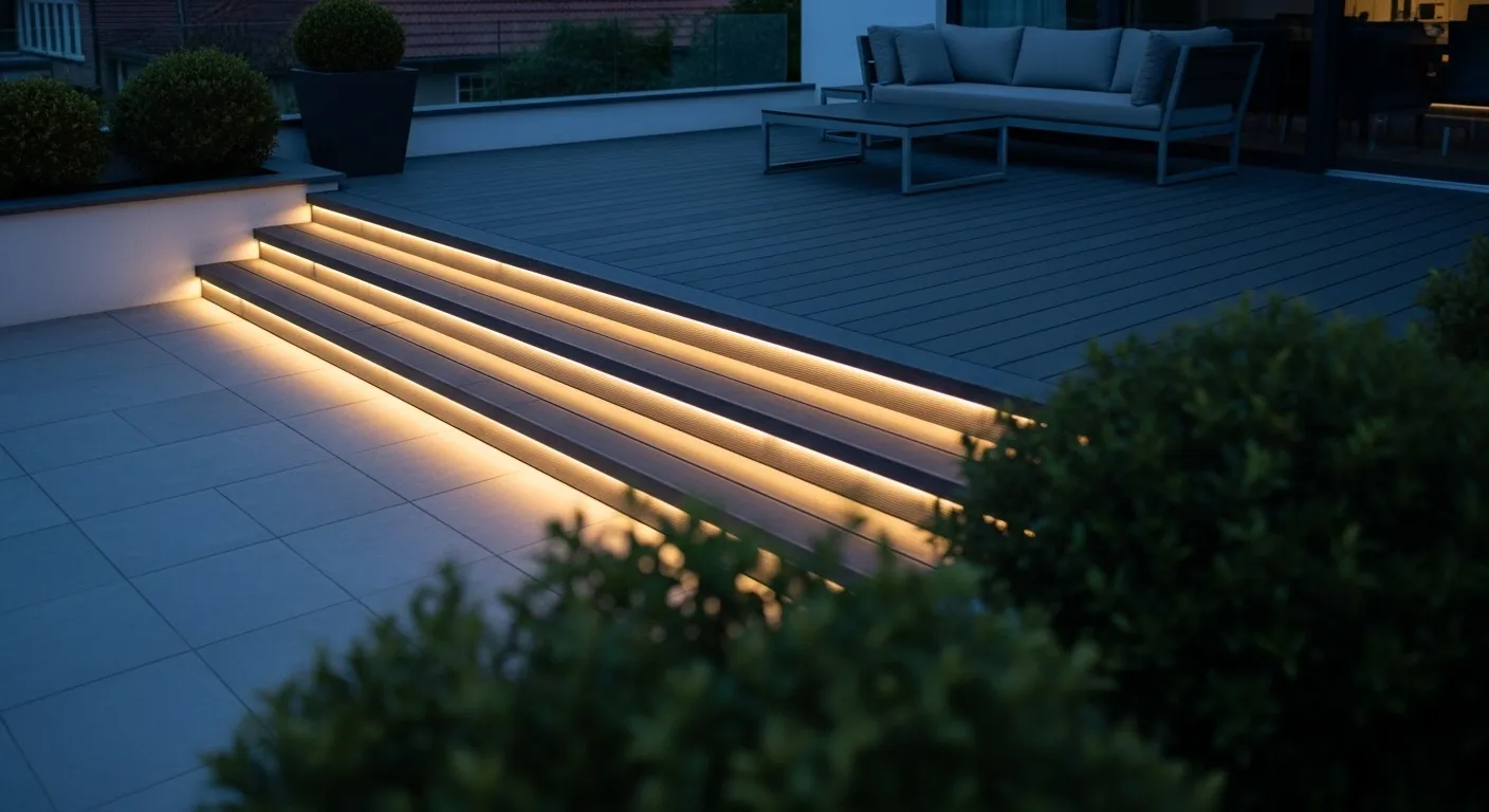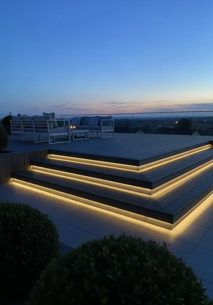 This rooftop terrace features layered steps with integrated warm LED strip lighting beneath each riser. The landing is finished in sleek gray porcelain slabs, and the glass railing keeps the edges visually light. As the sky turns deep blue, the lighting makes the materials glow softly.