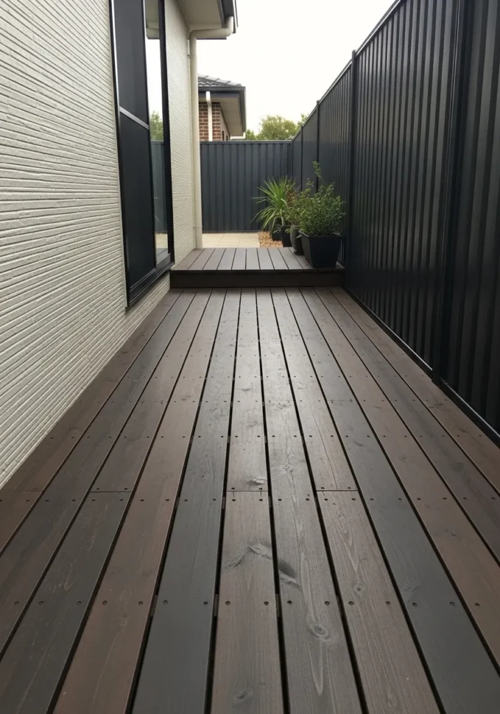 A narrow terrace is finished with slim warm toned wood decking boards laid lengthwise to enhance the space. A tall black vertical privacy screen runs along one side, creating a modern backdrop. The natural wood grain adds texture against the sleek dark wall.