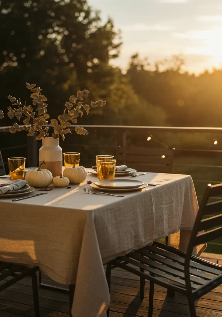 This outdoor setup captures the heart of autumn evenings with its simple yet elegant charm. A soft linen tablecloth drapes over a wooden table surrounded by black metal chairs, while small white pumpkins, amber glasses, and a neutral vase filled with dried eucalyptus branches add a soft seasonal touch. The golden-hour sunlight bathes everything in warm light, giving the space that serene, end-of-day glow that makes dining outdoors feel extra special.