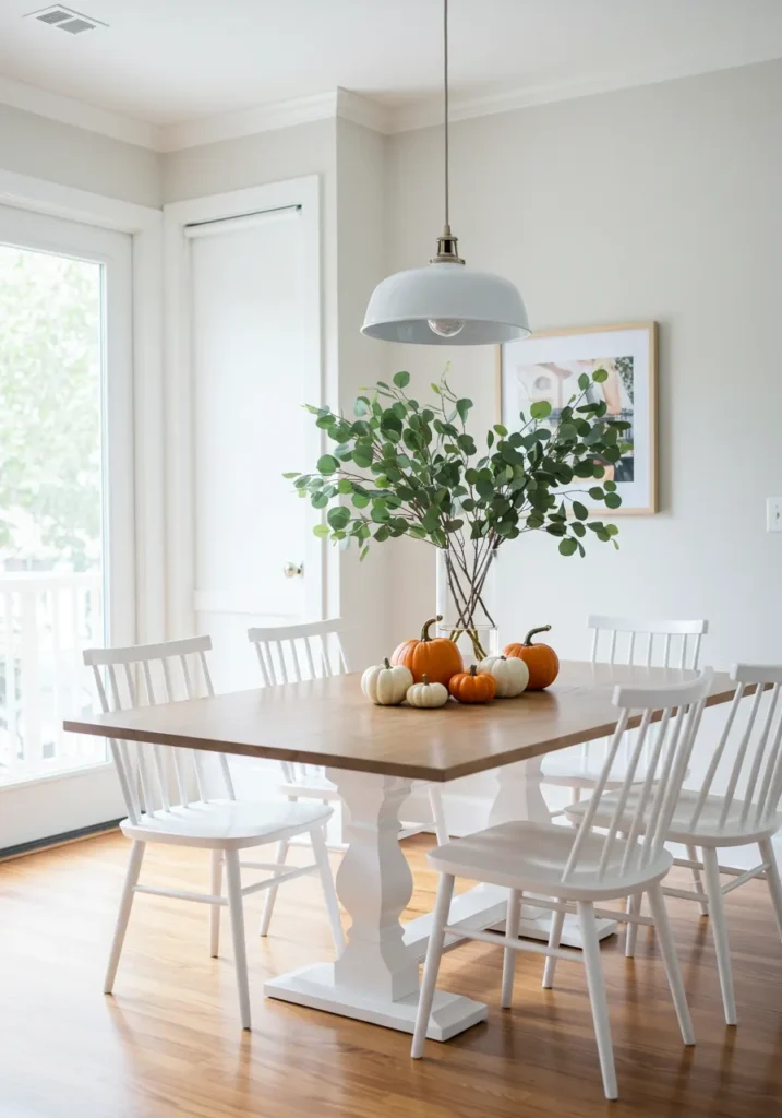 This dining setup feels cheerful and fresh, with a mix of orange and white pumpkins sitting under a vase of lush greenery. The natural light flooding in from the windows enhances the bright white furniture and soft wooden tabletop, keeping everything simple but full of charm.