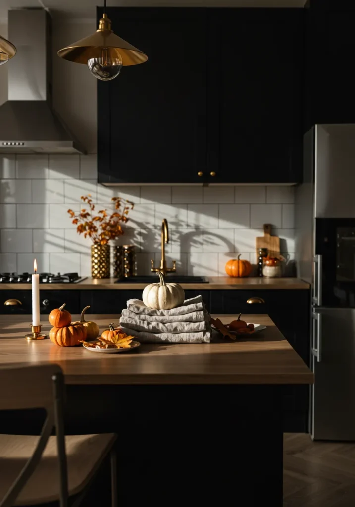 This sleek kitchen proves that fall decor can look elegant in darker spaces. The black cabinets and gold hardware create a dramatic backdrop for the warm pumpkins, linen napkins, and soft candlelight. Every element feels intentional, from the brass pendant lights to the autumn leaves scattered on the counter.