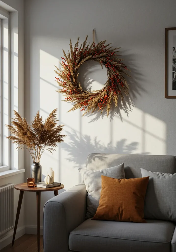 This sunlit corner feels peaceful and inviting, with a textured wreath made of dried grasses and red berries stealing the spotlight. The soft gray sofa, caramel pillow, and pampas grass arrangement all tie together perfectly, creating a calm and elegant Thanksgiving look.