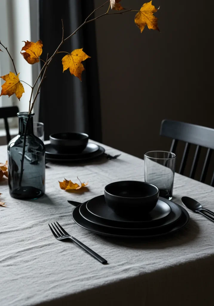I absolutely love how bold yet minimal this look feels. The matte black plates give off such a chic energy, and the scattered leaves add just the right touch of warmth. It’s modern, dramatic, and wonderfully understated all at once.