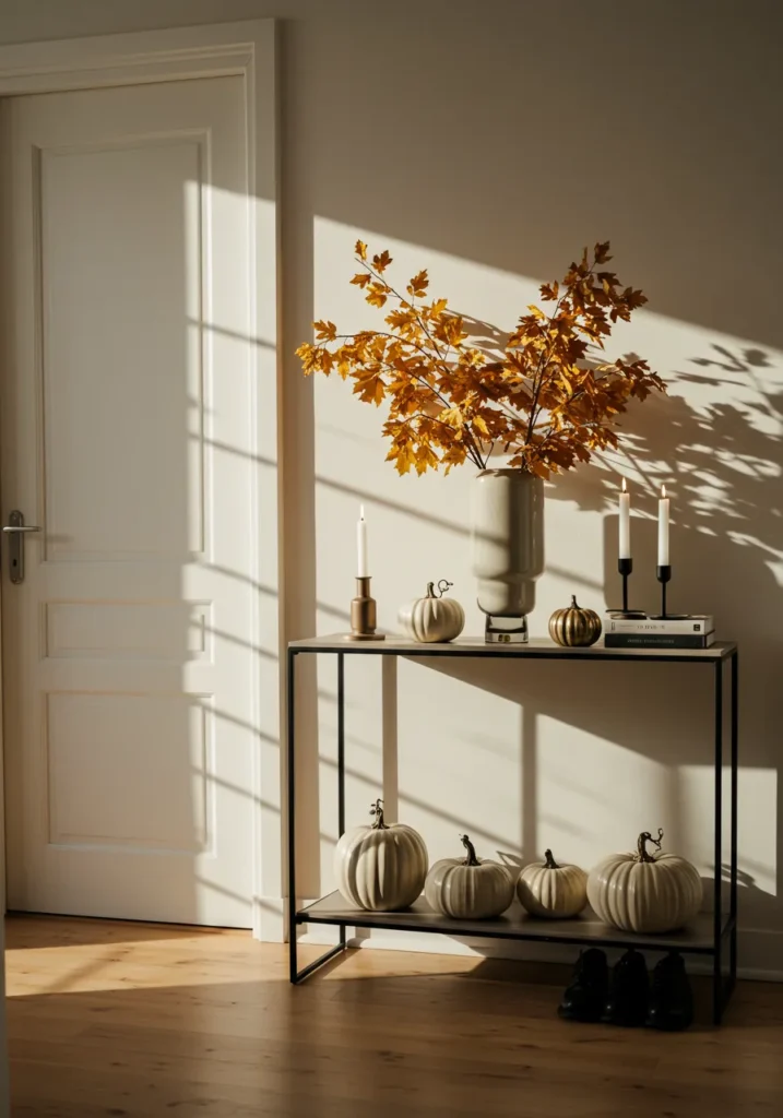 This entryway makes a stunning first impression with its minimalist console table and warm golden accents. A tall ceramic vase filled with amber leaves catches the afternoon sunlight, while neutral pumpkins and sleek candleholders bring balance to the space. The shadows falling across the wall create that cozy, late-day calm that feels like autumn at its best.