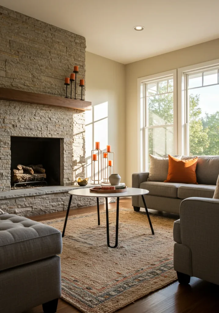 This living room feels timeless with its stone fireplace, soft neutral furniture, and cozy accents in pumpkin orange. A mix of candles, textured throws, and sunlight streaming through the windows make the space glow naturally. The balance between the rustic stone and sleek modern furniture creates a perfect Thanksgiving-ready look.