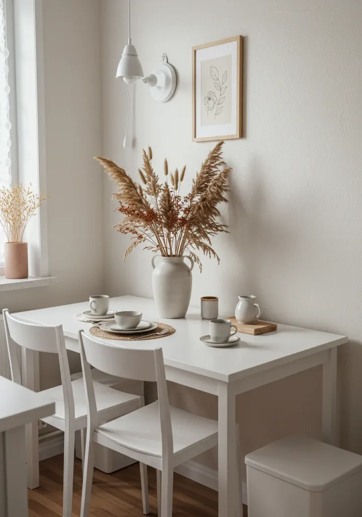 This small breakfast nook feels light and calming with soft beige tones and natural elements. The pampas grass arrangement adds texture, while the simple ceramic dishes and woven placemats create a laid-back, cozy feel. Morning light fills the space, making it the perfect spot for coffee and conversation.