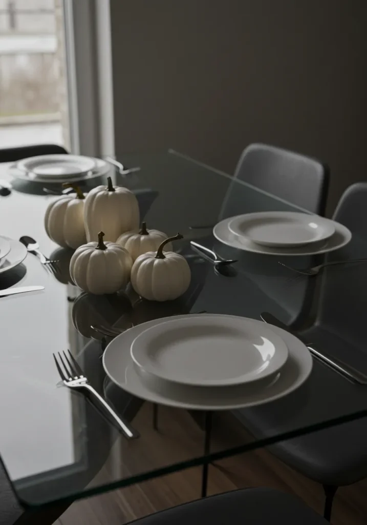 This dining setup takes modern minimalism to a new level. A clear glass table is paired with black leather chairs and simple white plates, while small white pumpkins sit in the center as a clean, stylish nod to the season. The result is a cool, understated take on Thanksgiving that still feels special.