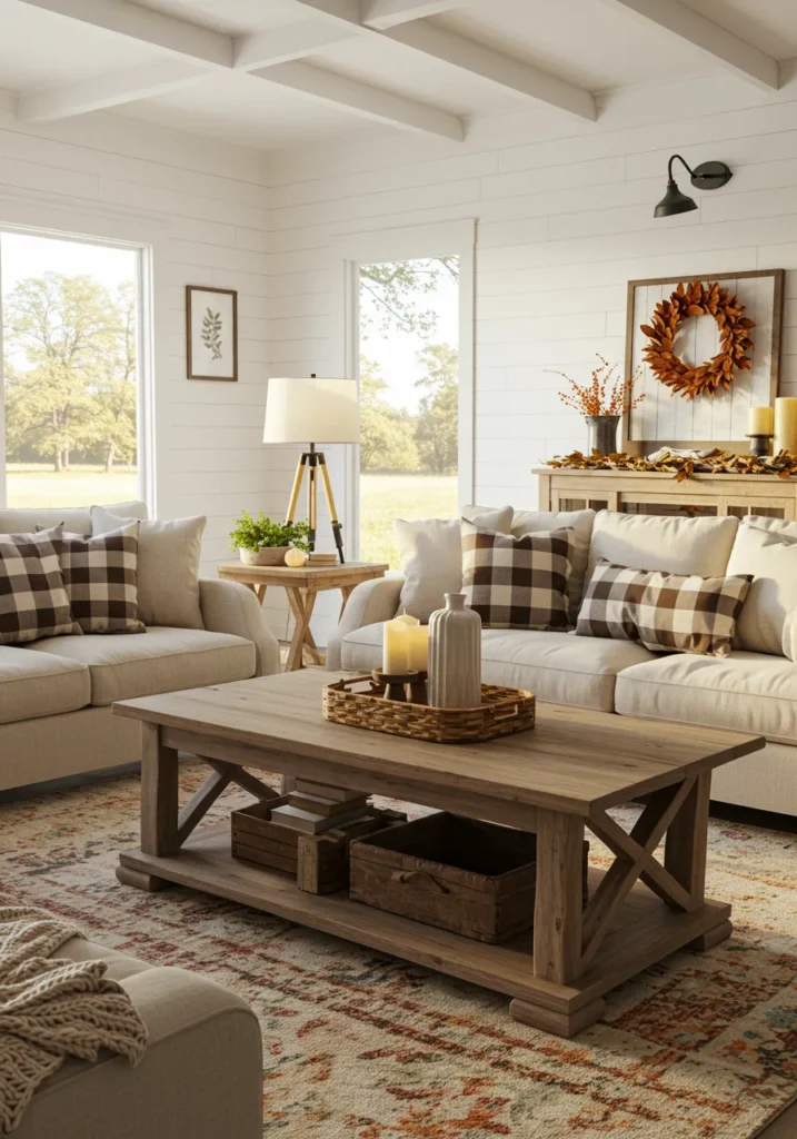 This farmhouse-inspired living room mixes classic comfort with subtle fall charm. Creamy sofas, plaid pillows, and natural wood furniture set the scene, while the autumn wreath and scattered pumpkins add seasonal warmth. Soft sunlight makes the space feel homey and bright.