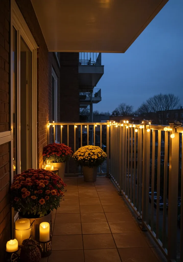 This balcony turns a small outdoor space into a glowing autumn retreat. String lights line the railing, soft candles flicker beside pots of red and yellow mums, and the cool evening sky creates a beautiful contrast. The setup feels warm, intimate, and full of seasonal charm.