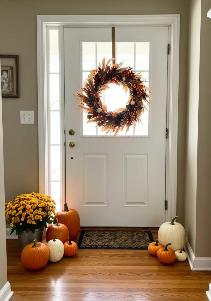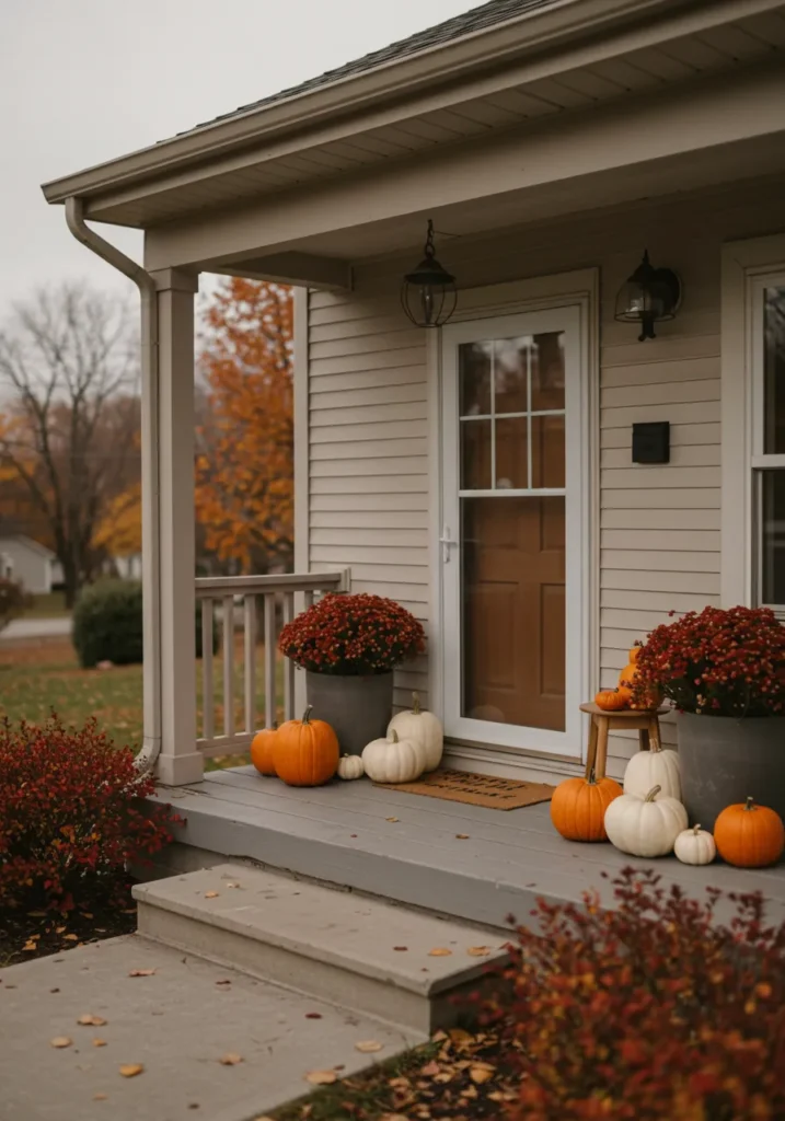 This cozy front porch shows that simple touches can make a huge difference. White and orange pumpkins rest beside pots of deep red mums, adding rich fall color against the soft beige siding. A natural welcome mat ties the look together and makes the whole entrance feel friendly and festive.