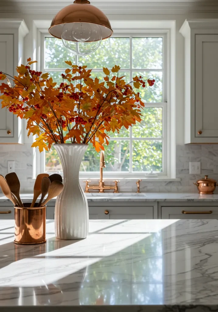 This kitchen feels alive with light and warmth. A tall vase filled with golden maple leaves and red berries instantly adds color to the marble countertop, while copper fixtures and utensils bring out a soft, elegant glow. The sunlight pouring through the window makes every detail shimmer, creating a scene that feels crisp and cheerful.
