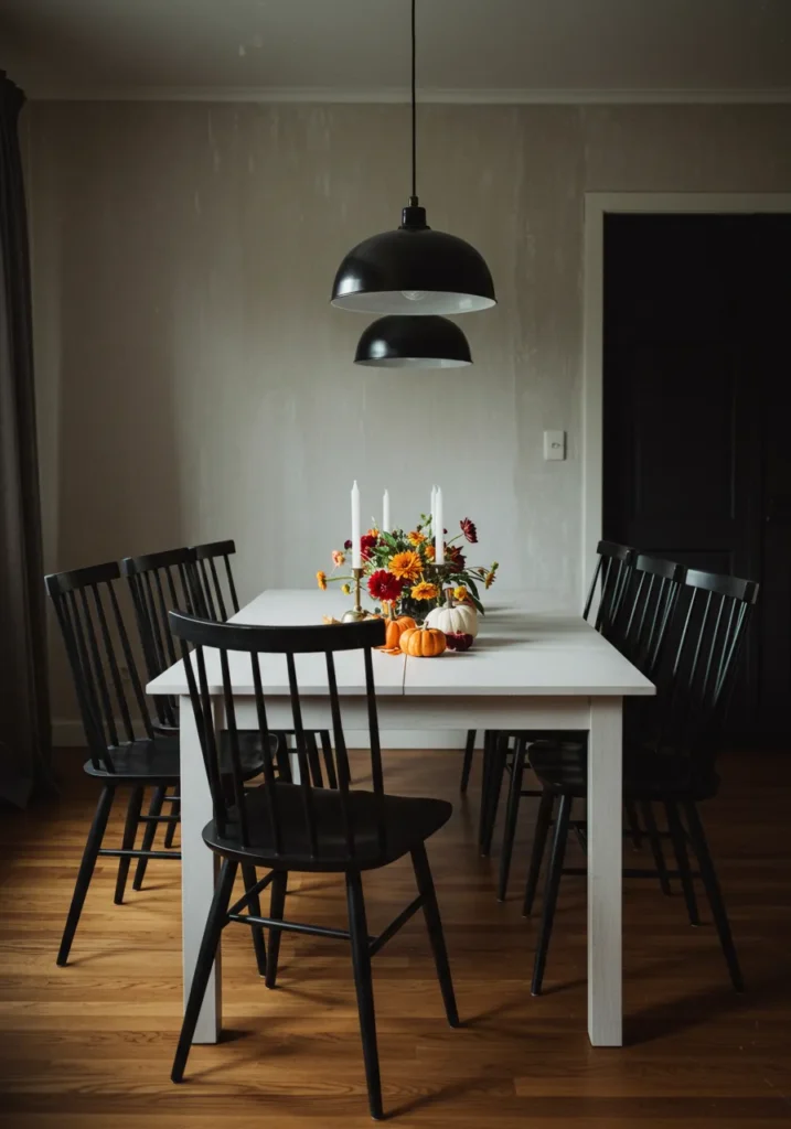 This dining room brings together cozy warmth and modern edge. The white table anchors the space while black spindle chairs and sleek pendant lighting add bold contrast. A centerpiece of fresh flowers and mini pumpkins ties the look together with a subtle Thanksgiving touch that feels both elegant and relaxed.