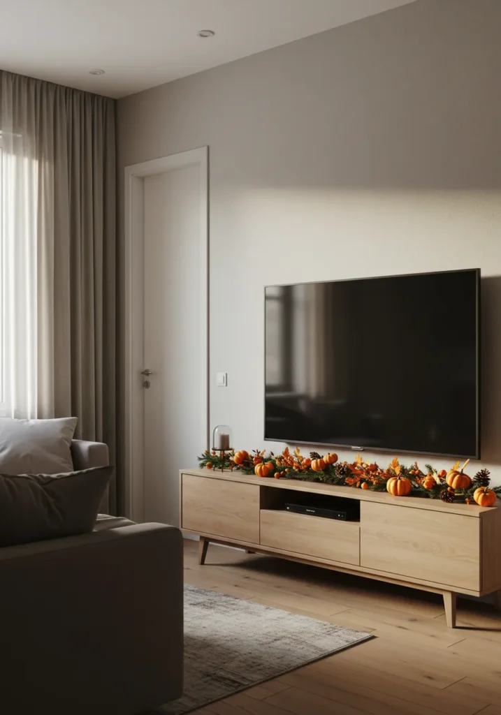 This living area embraces clean design while sneaking in a bit of festive fun. The TV console is decorated with a row of mini pumpkins, pinecones, and greenery that gives the room just enough holiday spirit without overwhelming the minimalist aesthetic. The natural wood tones and soft curtains complete the warm, understated look.