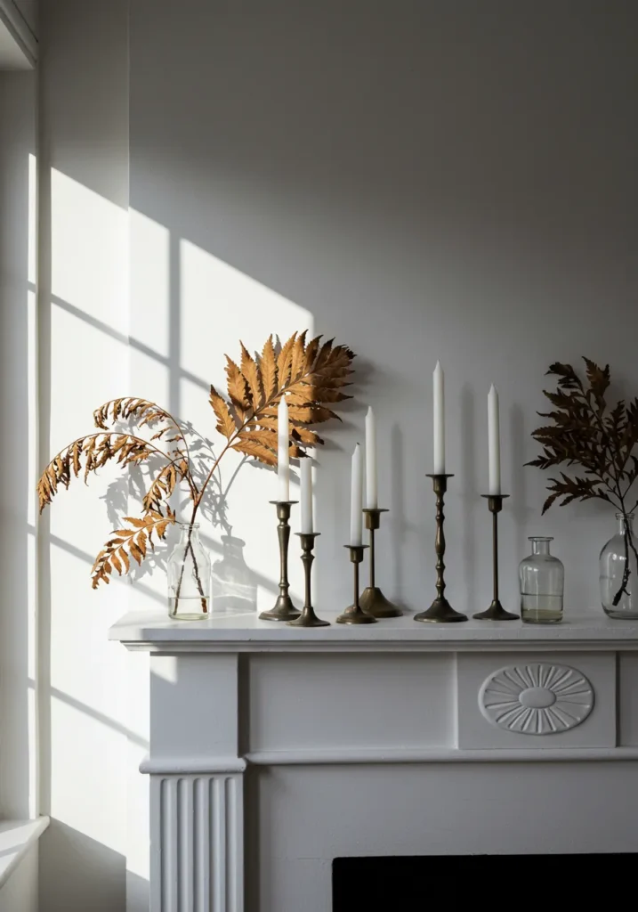 This mantel setup feels calm and elegant with its muted tones and natural textures. A mix of brass candlesticks, clear glass vases, and dried leaves catches the afternoon light beautifully, creating a soft, golden glow. The overall look is minimal yet full of character.