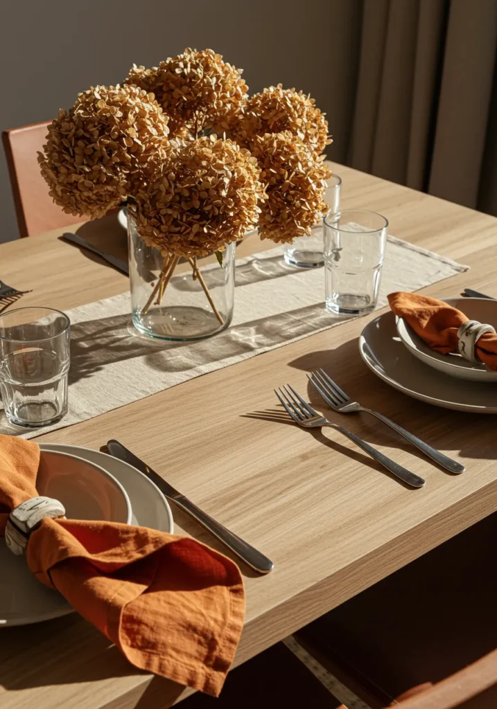 This dining table captures autumn warmth with its neutral wood surface, soft linen runner, and dried hydrangea centerpiece. Burnt orange napkins add a lovely pop of color that ties the look together. Every detail feels intentional, yet the whole setup feels natural and relaxed.