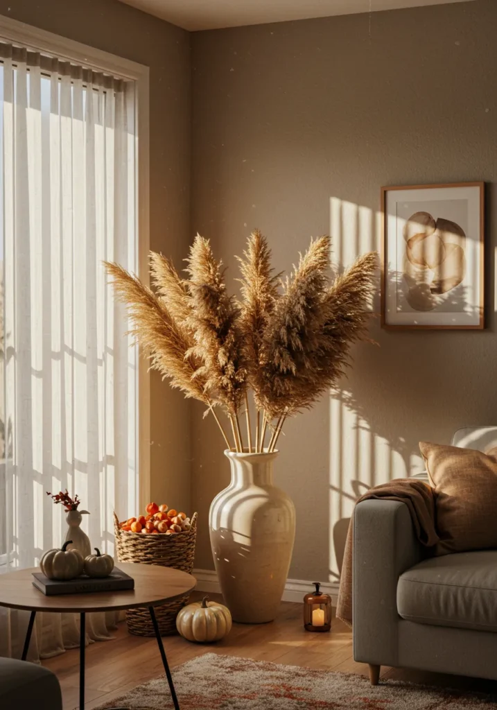 This cozy corner feels serene and sunlit, filled with soft earth tones and natural materials. A large vase of pampas grass adds height and texture, while small pumpkins, woven baskets, and candles bring warmth and depth to the space. The sunlight filtering through the curtains creates a peaceful glow.