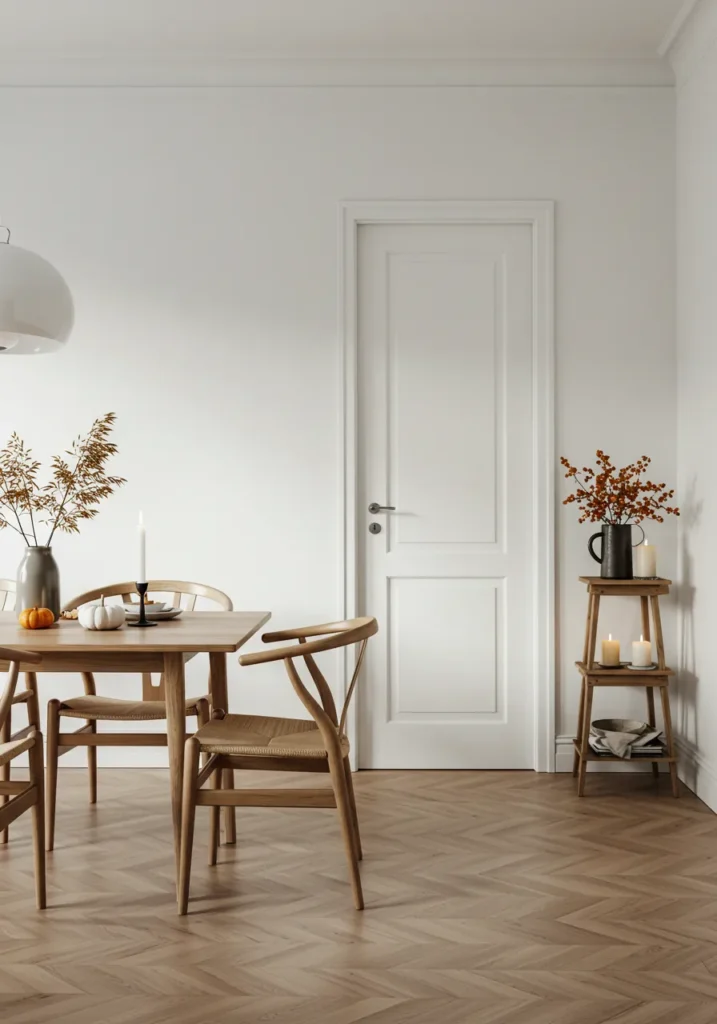 This dining area pairs Scandinavian simplicity with fall-inspired accents. Clean white walls and natural wood furniture create a light, airy base, while a few carefully chosen touches—like a vase with golden branches, white pumpkins, and soft candlelight—bring subtle warmth. The space feels calm, uncluttered, and stylishly seasonal without any excess.