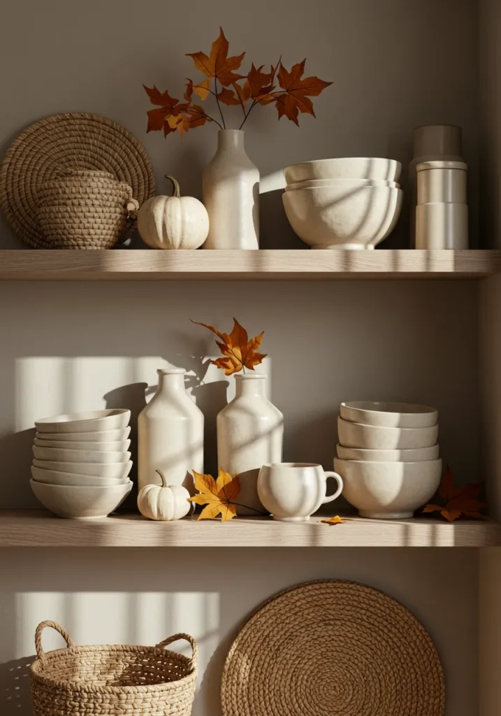 This shelf setup feels like a study in soft, natural beauty. Creamy ceramics, woven baskets, and maple leaves are arranged in a way that feels organic and relaxed. The play of sunlight across the neutral tones adds warmth, while tiny white pumpkins and amber leaves give it just enough Thanksgiving personality.