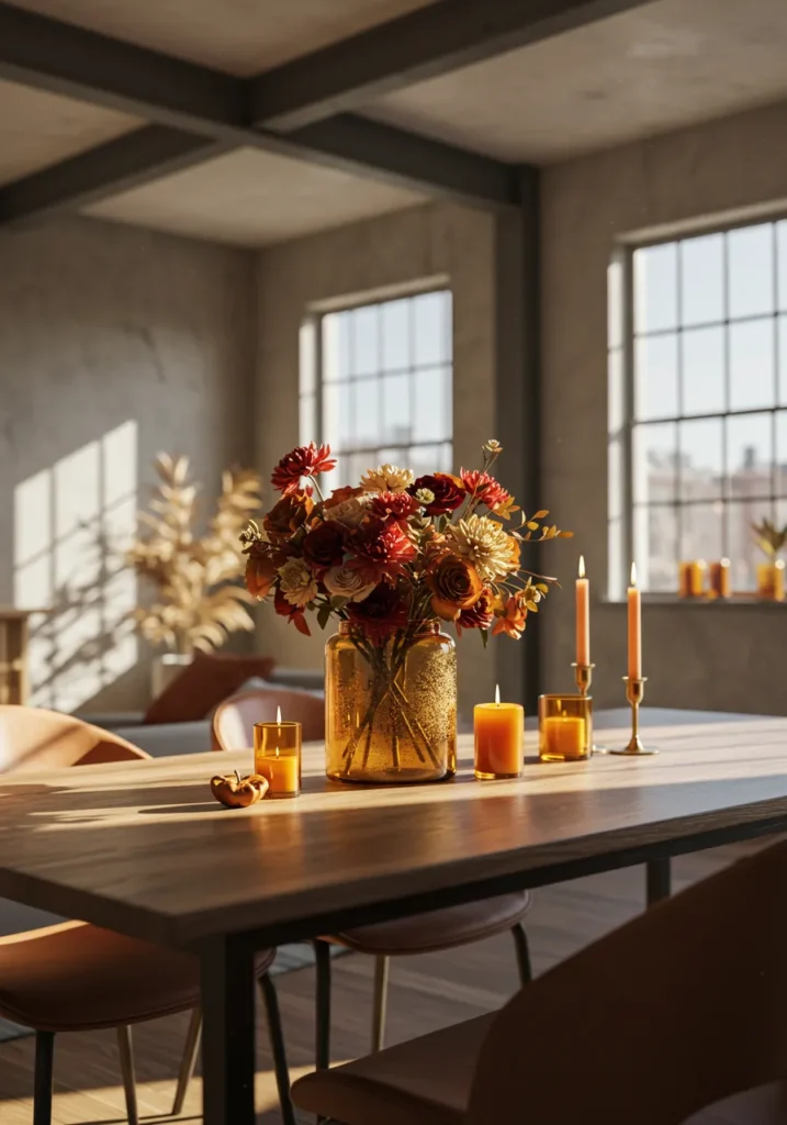 This modern dining table glows with autumn elegance. A large amber glass vase holds a lush arrangement of orange and burgundy blooms, surrounded by golden candles that flicker softly in the afternoon light. The industrial windows and neutral tones make the space feel open, while the warm centerpiece adds just the right dose of seasonal cheer.