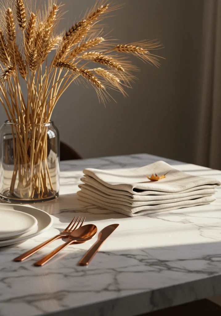 This marble-top table sets a calm and modern tone with its natural wheat centerpiece standing tall in a glass vase. Warm sunlight hits the bronze cutlery and neutral linens, creating a soft, organic feel that blends luxury and simplicity. The muted colors make the texture of the wheat and stone surface really stand out.