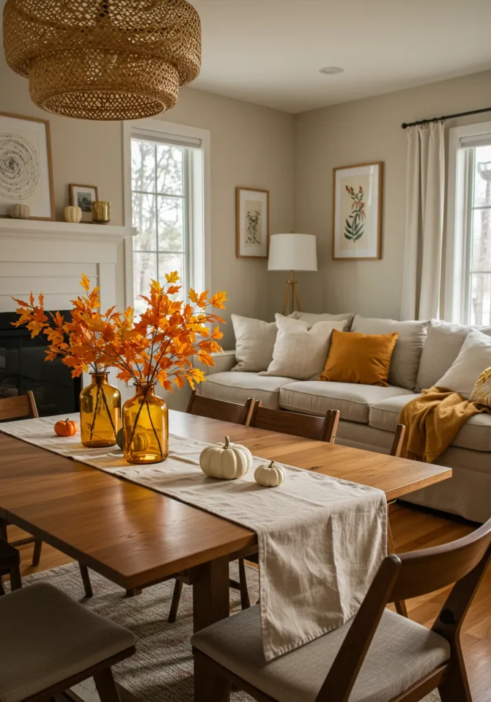 This cozy space ties the living and dining areas together with a warm autumn palette. Amber vases filled with golden leaves brighten the wood table, while white pumpkins keep it balanced and fresh. Soft beige walls, woven light fixtures, and layered textiles add comfort and warmth to the space.