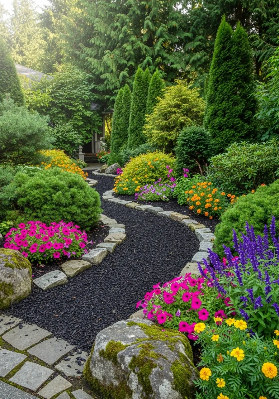 I can’t get over how dramatic and modern black mulch looks. It’s like a little black dress for the garden—elegant, timeless, and a total showstopper. Not only does it highlight the bright flowers beautifully, but it also helps retain moisture and suppress weeds, which means less work and more time to enjoy the view. Honestly, this is the kind of landscaping that makes neighbors stop and stare.