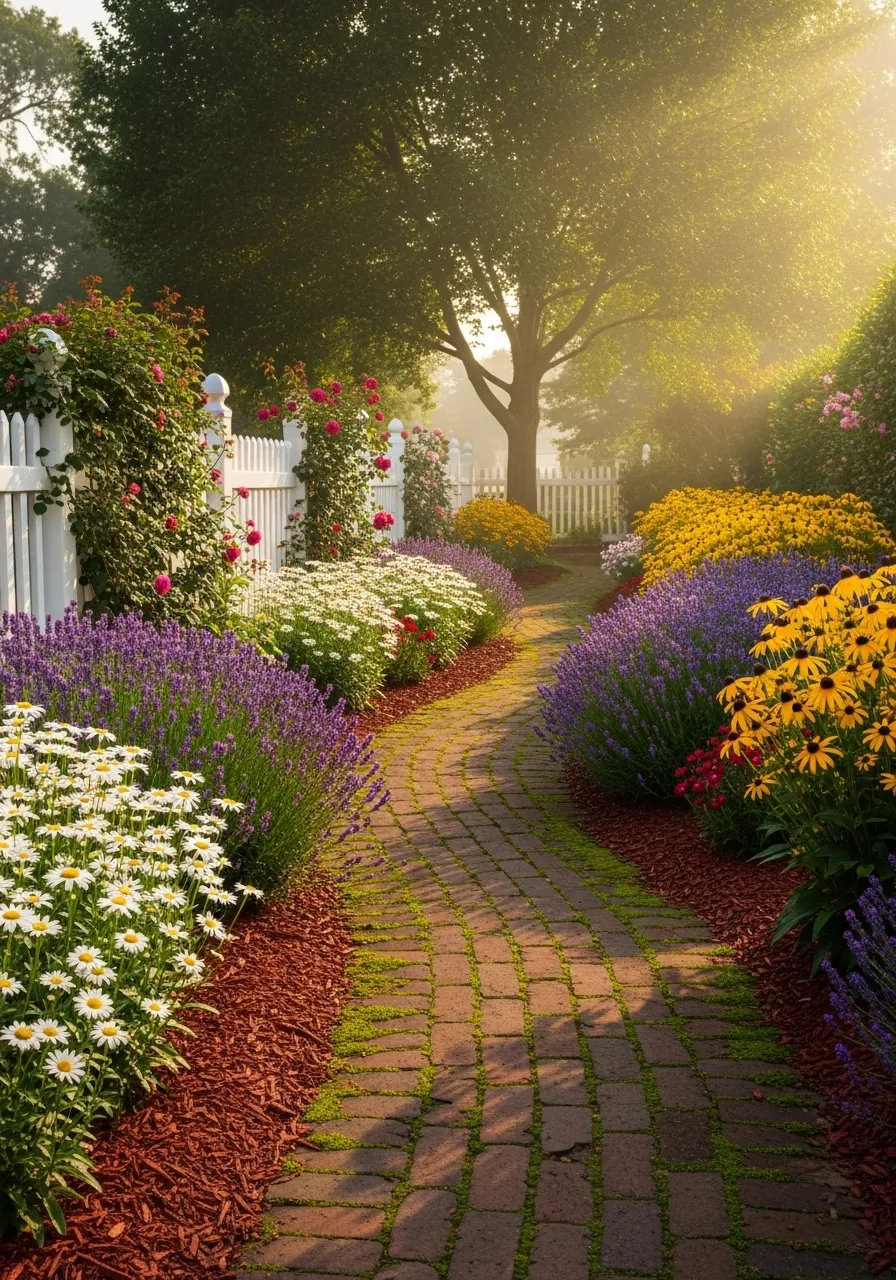 A winding brick pathway creates the perfect storybook entrance to this dreamy garden, lined with lush blooms and rich, earthy mulch. The crisp white picket fence adds a touch of classic charm while framing the explosion of daisies, lavender, and bright yellow coneflowers. The contrast between the deep red mulch and vibrant greenery makes everything pop, creating a cottage-style landscape that feels both cozy and elegant.
