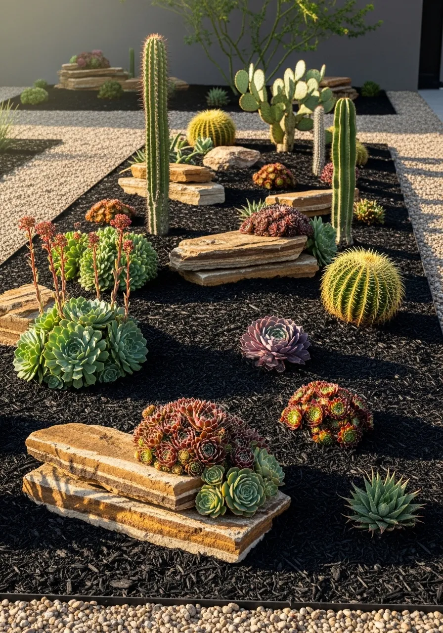 This stunning desert landscape proves that a low-water garden can still be bursting with color and texture. A mix of succulents, cacti, and drought-tolerant plants nestle into black mulch, creating striking contrast against natural stone and gravel. The layered rocks add depth, while the vibrant greens, oranges, and blues of the succulents bring a refreshing energy to the arid surroundings.