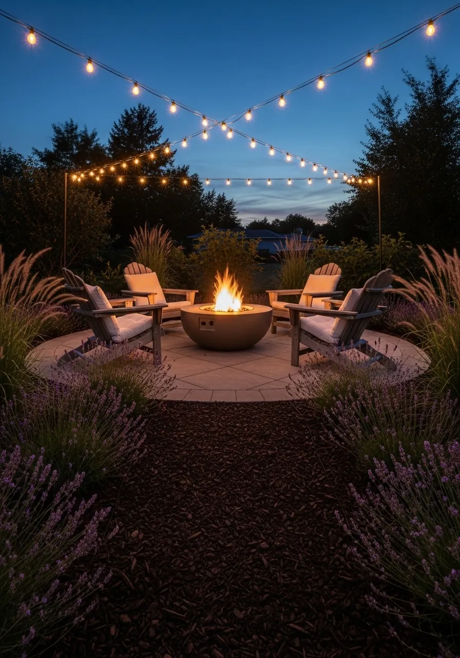 Cozy Fire Pit Patio with String Lights and Mulch Pathway
