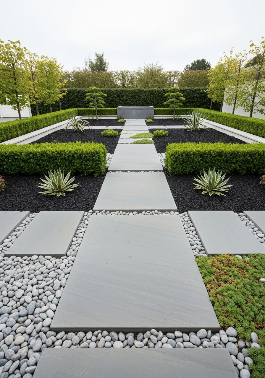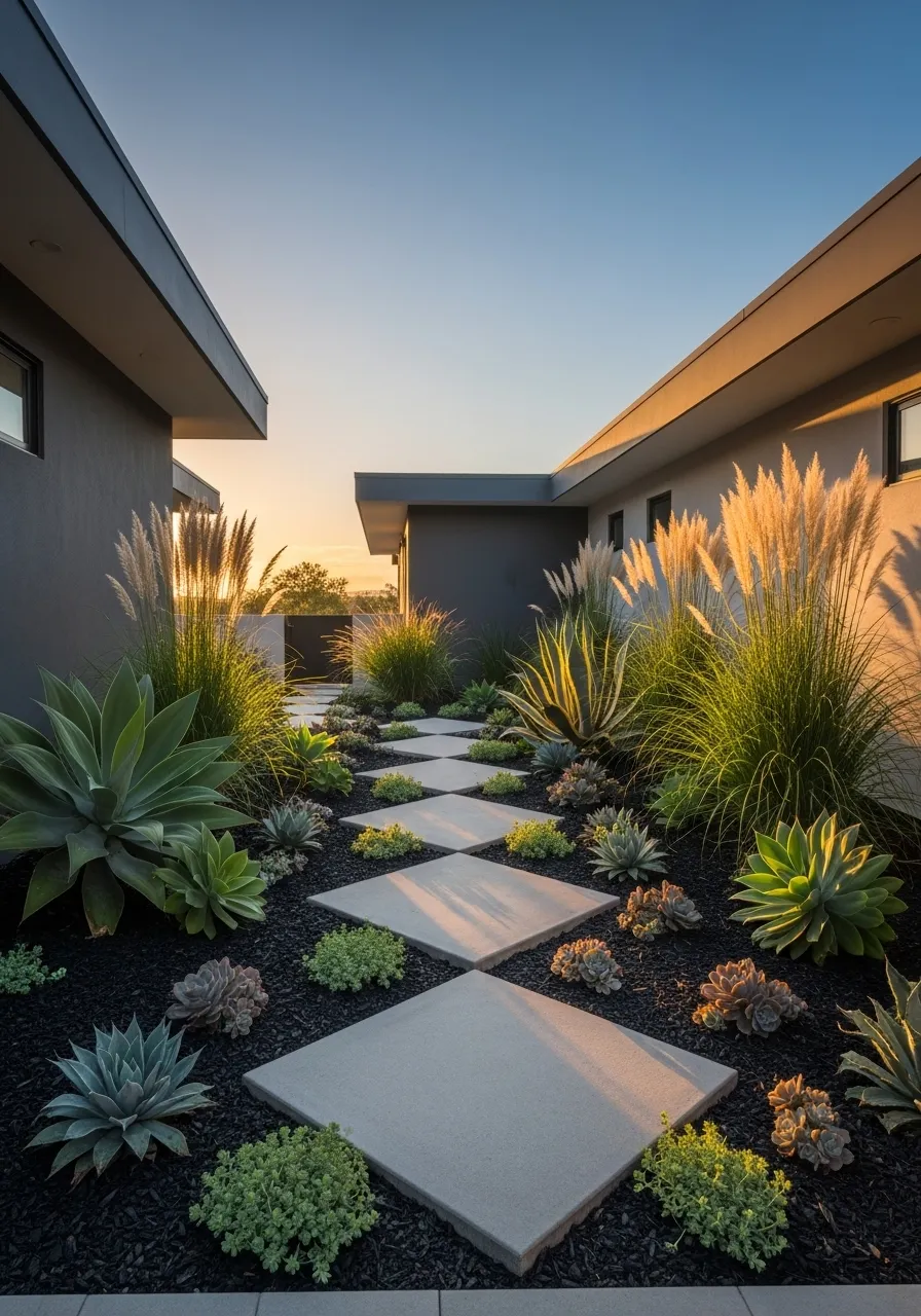 Minimalist meets lush greenery in this sophisticated modern garden. A crisp row of succulents lines a clean stepping stone pathway, surrounded by deep black mulch that enhances the contrast between textures. The dark exterior of the home blends seamlessly with the natural tones of the landscaping, while neatly pruned shrubs and ornamental grasses soften the structured lines.