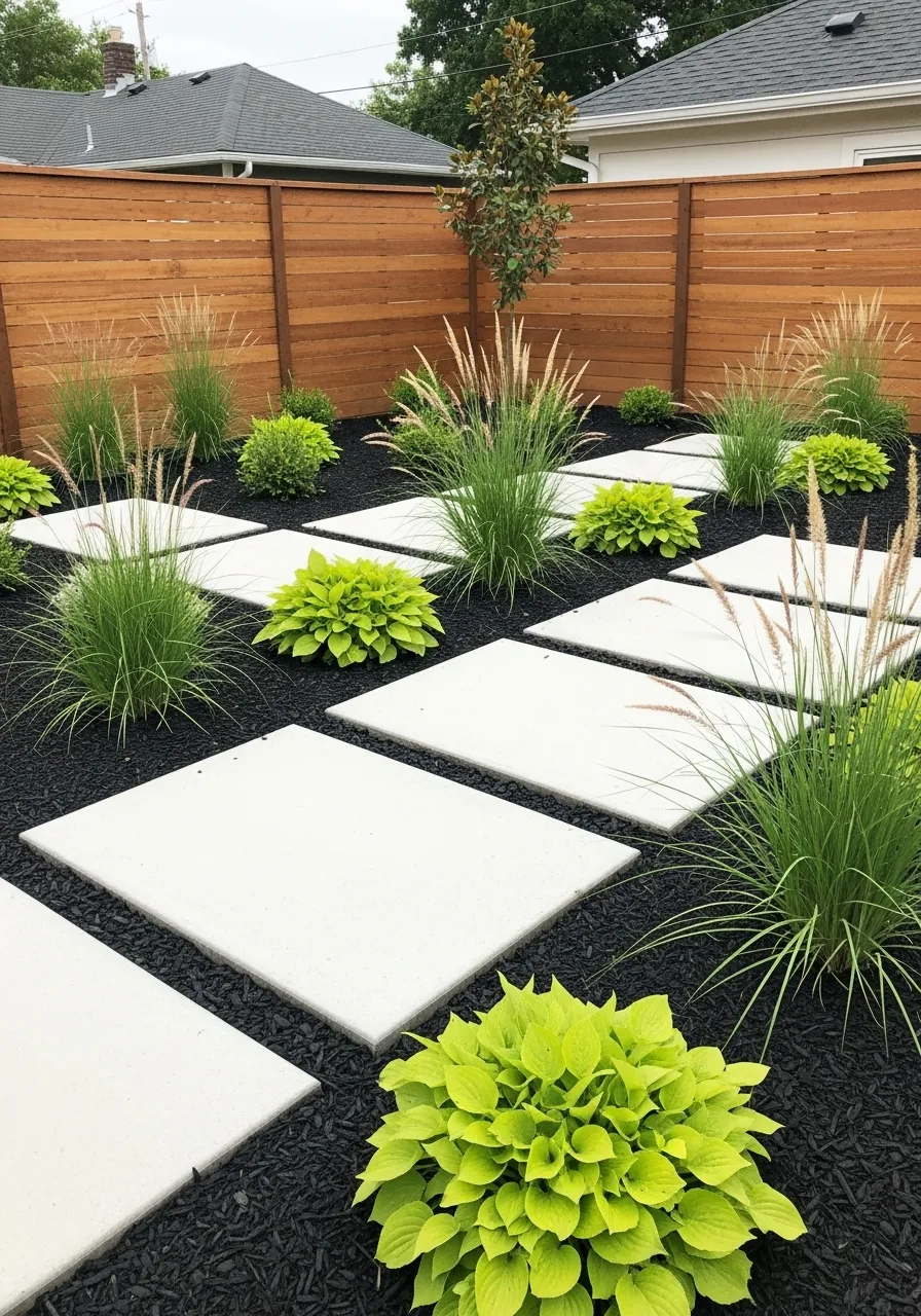 A sleek, structured walkway leads through this stunning backyard, where black mulch creates a striking contrast against the crisp concrete pavers. Clean lines define the space, with ornamental grasses and bright greenery softening the bold, modern aesthetic. The warm wood fencing adds a natural touch, keeping the look polished yet inviting.