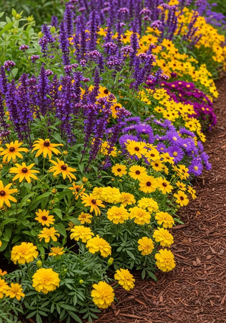 A lively mix of bright yellow and purple flowers dances along this mulch-lined garden bed, adding a cheerful burst of color. Lush greenery and a variety of plants create depth, making the space feel effortlessly abundant. The rich brown mulch not only enhances the vibrancy of the blooms but also helps retain moisture and keep weeds at bay.