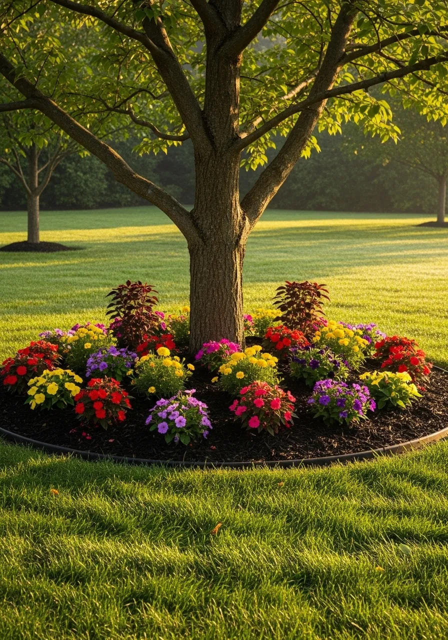 This cozy garden spot highlights how mulch can beautifully frame a mature tree surrounded by small, colorful plants. The dark mulch contrasts perfectly with bright greenery and delicate blooms, creating a clean and tidy look. The rounded bed shape makes this area look neat and inviting, seamlessly blending the landscaping with the lush lawn around it.