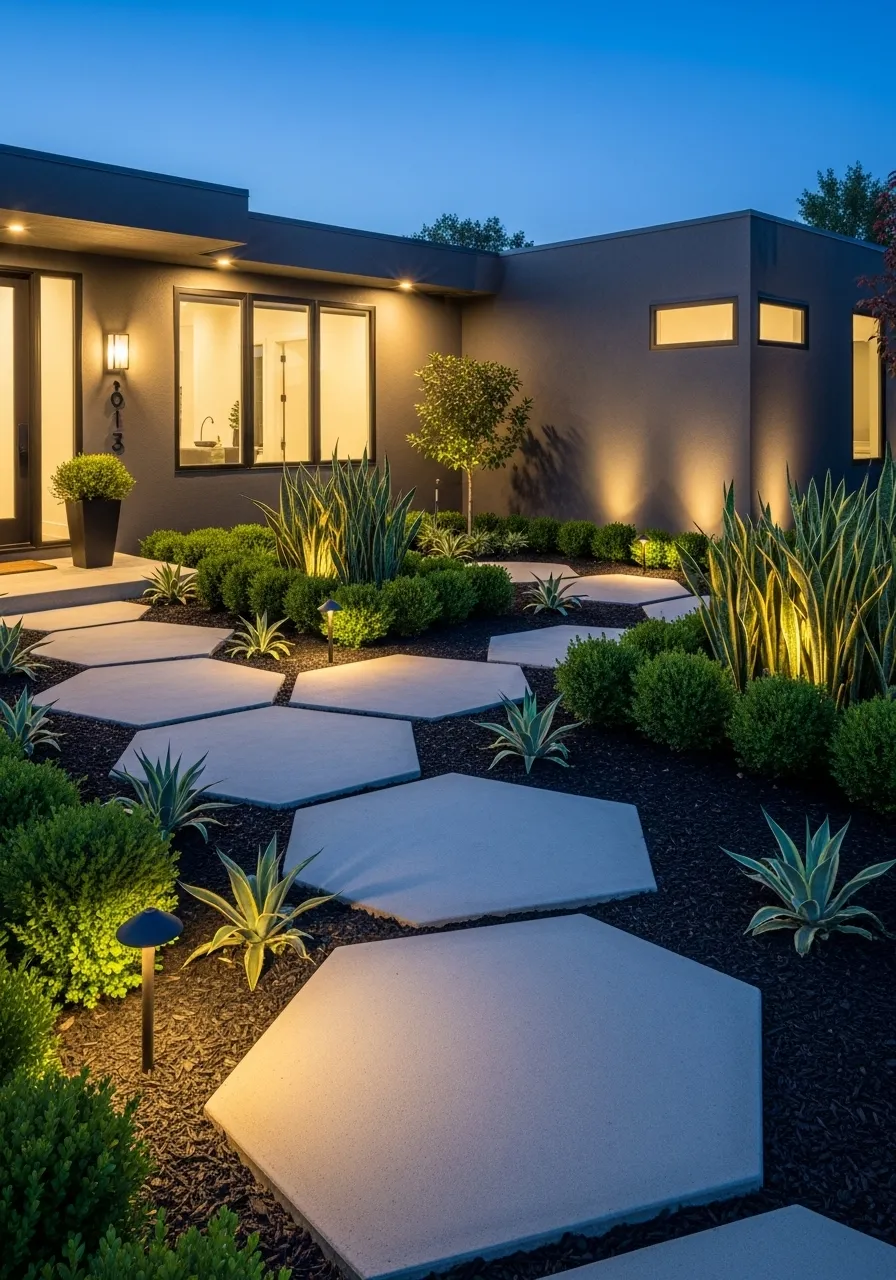 I love how this design makes such a statement while still being low maintenance. The black mulch gives everything a crisp, uniform look, and those glossy pavers. Absolutely stunning! The lighting takes it to another level, making the whole yard glow in the evening. If I lived here, I’d feel like I was walking up to a five-star hotel every time I came home!