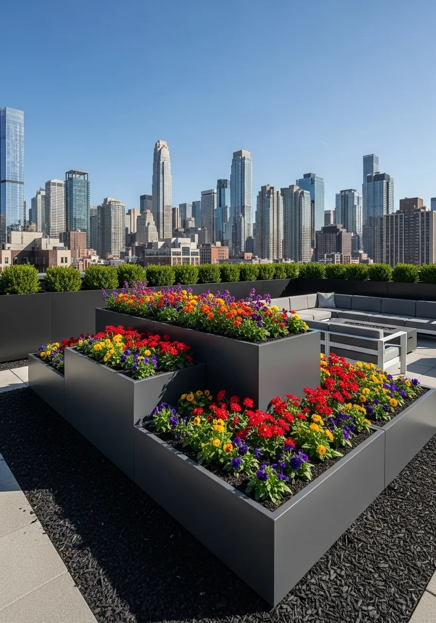 This stylish rooftop terrace features sleek garden beds filled with vibrant flowers and plants, all neatly finished with rich black mulch. The bold colors of purple, yellow, and orange flowers pop beautifully against the mulch’s dark surface, creating an eye-catching contrast. The sleek, modern planter boxes enhance the chic, city vibe, turning the space into an urban paradise.