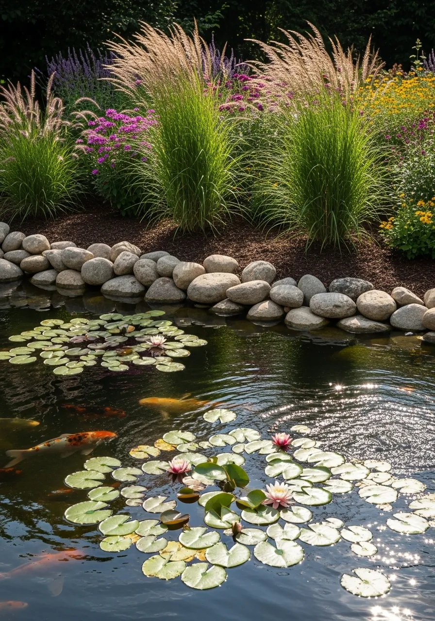 A dreamy backyard oasis comes to life with this lush koi pond, framed by natural stone and rich mulch. Water lilies float gently on the surface while vibrant koi fish add a pop of color. Tall grasses and blooming flowers blend seamlessly into the surrounding greenery, creating a peaceful, almost magical atmosphere.