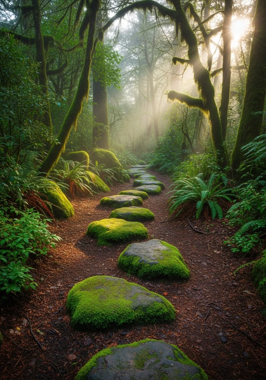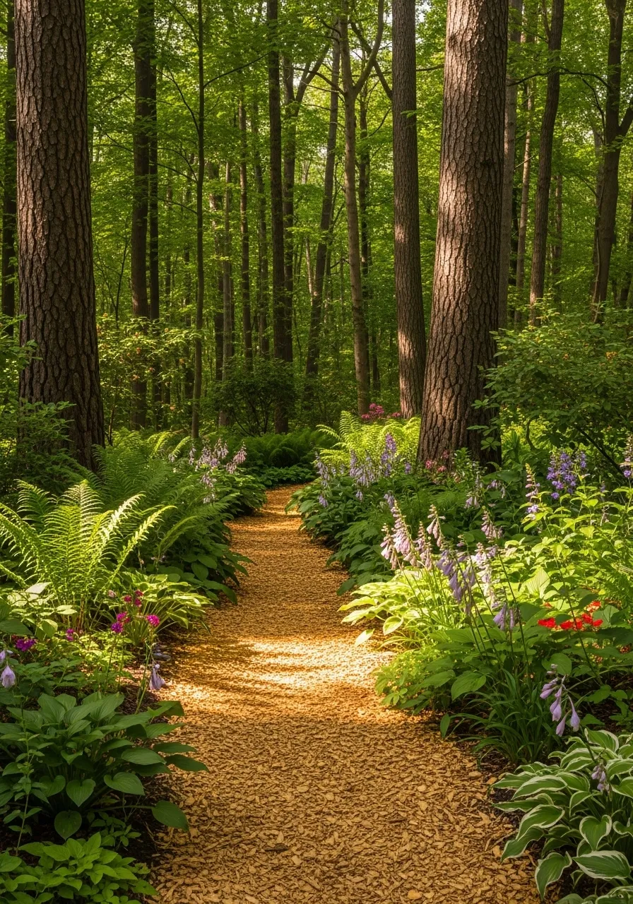 Enchanting Forest Pathway with Mossy Mulch Accents