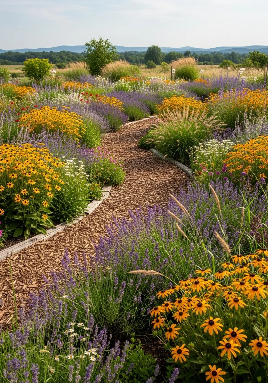 A dreamy meadow of golden black-eyed Susans and delicate wildflowers stretches under the sun, creating a natural, effortless beauty. The warm brown mulch blends seamlessly with the earthy tones of the landscape while keeping the garden beds looking tidy. Soft wisps of lavender and native grasses add movement, making this space feel like a little slice of the countryside.