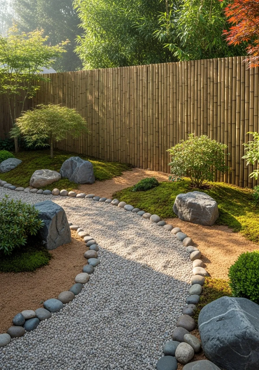 I’m absolutely obsessed with how calming this space feels. The combination of gravel, stones, and bamboo makes it feel like a place designed for relaxation, like a personal meditation spot right at home. And the way the light filters through the bamboo? Dreamy! If I had this garden, I’d be out here every morning, sipping tea and pretending I’m at a luxury spa!