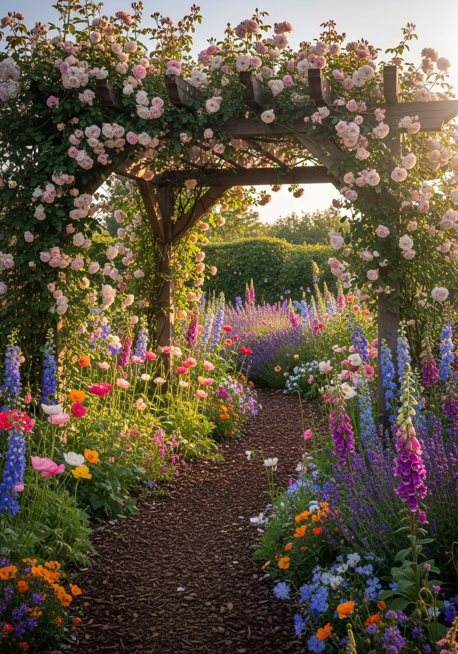 I can’t get enough of how magical this space feels! The pergola adds such a romantic touch, and the explosion of colors makes it look like something straight out of a fairy tale. The mulch keeps everything looking neat while letting the flowers take center stage. If I had this in my backyard, I’d be spending all my afternoons here with a book and a cup of tea, soaking in the beauty!