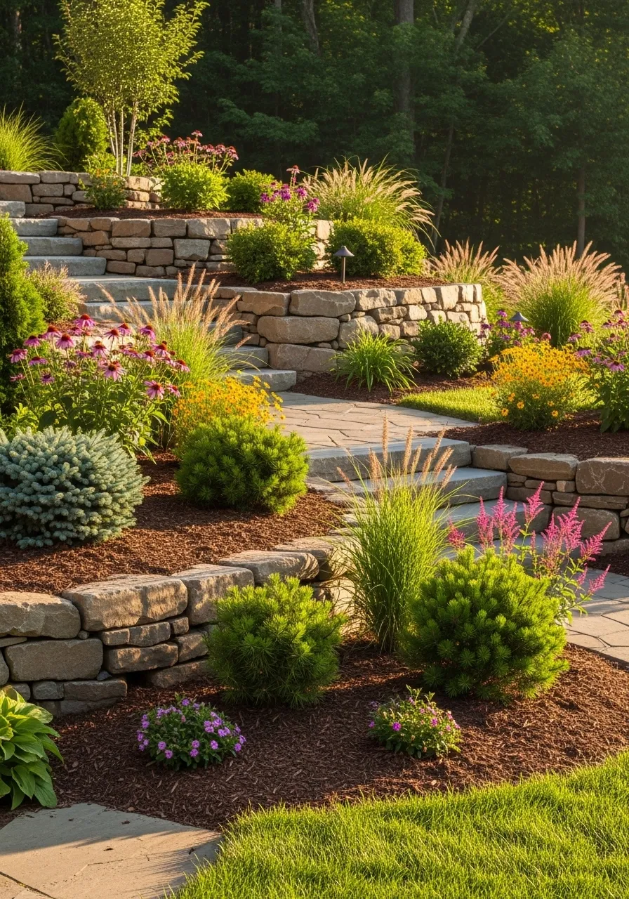 This stunning front yard takes landscaping to new heights—literally! Beautifully stacked stone retaining walls create a terraced garden that blends seamlessly with the natural surroundings. The deep brown mulch beds provide a rich contrast to the vibrant greenery, making every plant pop. Thoughtfully placed evergreens, ornamental grasses, and flowering perennials add texture and depth, giving this space an elegant yet effortless feel.