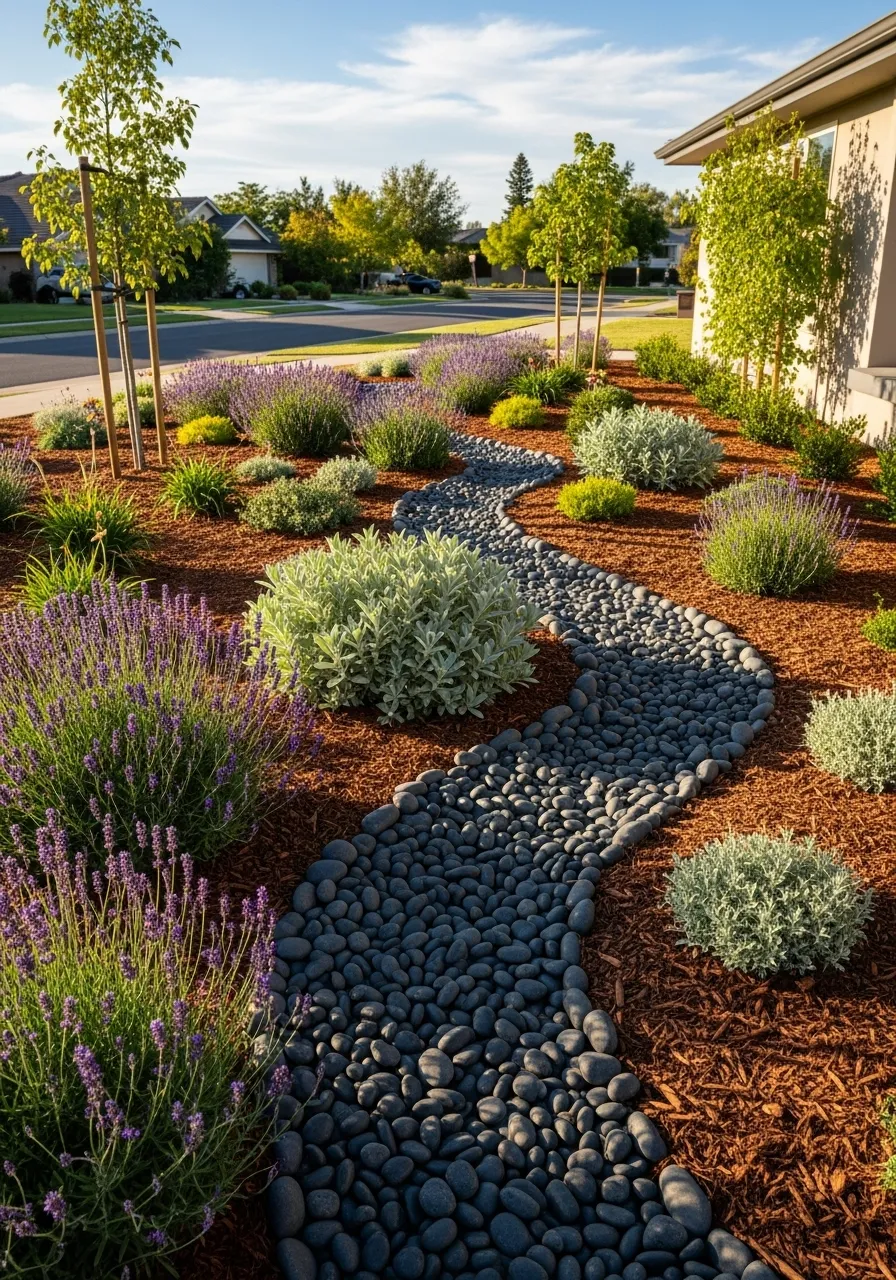 This front yard is the perfect example of beauty and sustainability working together. A meandering dry creek bed of smooth black river stones winds through a stunning mix of lavender, sage, and native drought-tolerant plants. Deep brown mulch surrounds the greenery, helping retain moisture while adding a tidy, finished look. The combination of soft, flowing plants and rugged natural stone creates a design that’s both structured and organic.