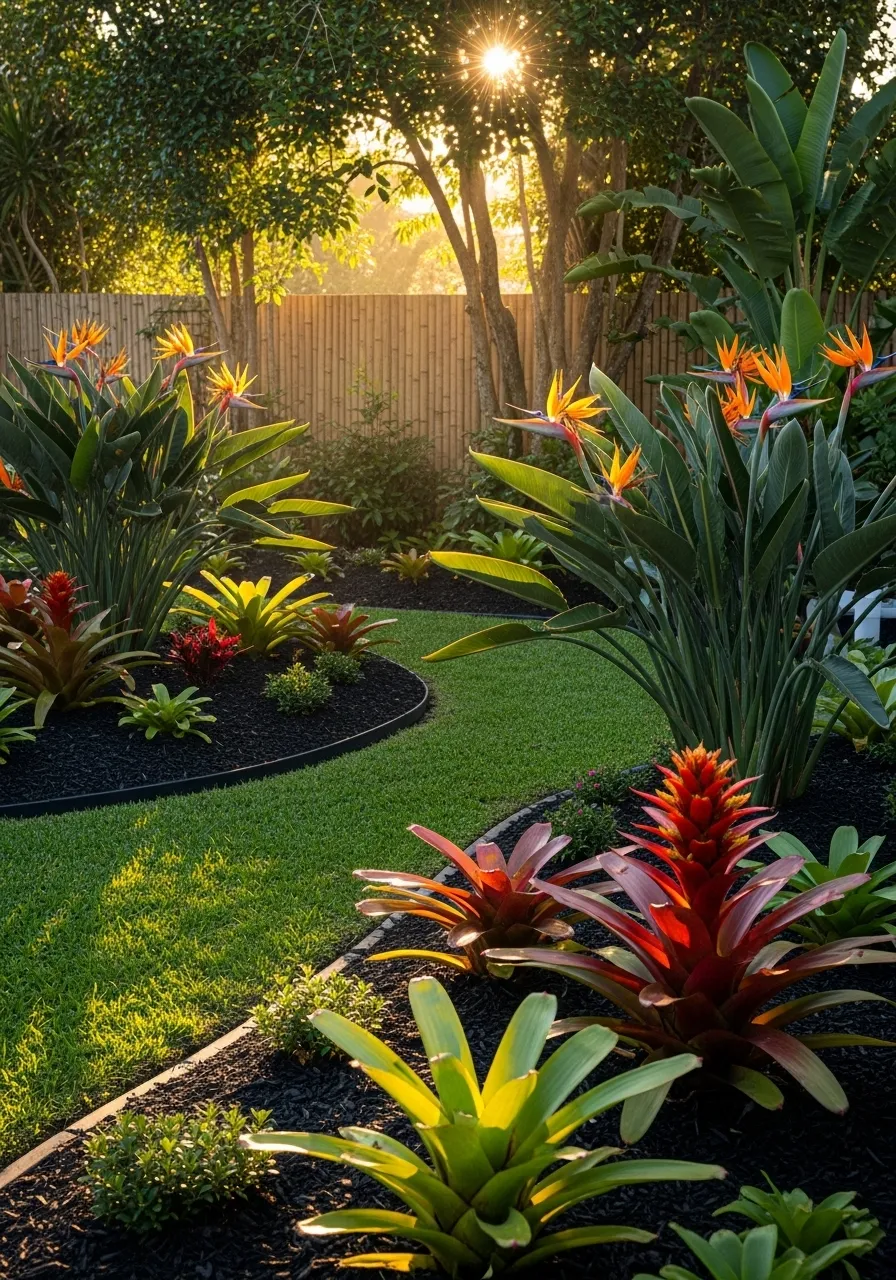 This lush tropical garden is bursting with bold colors and exotic greenery. A natural bamboo fence creates a warm, tropical backdrop, while deep black mulch provides a striking contrast to the vibrant red, yellow, and green foliage. Large, sculptural plants like birds of paradise and bromeliads add height and drama, making this space feel like a private jungle retreat.